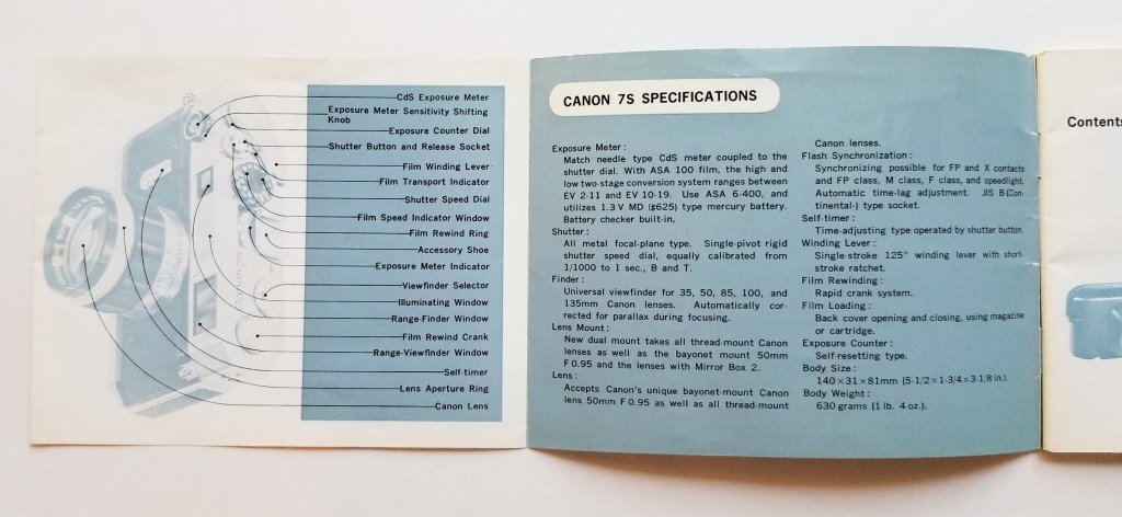 I’ve decided that I’m unlikely to acquire the Canon Model 7s which was an upgrade to the original Canon 7 (1961-1964). I have ‘lots’ of 35mm rangefinders in my classic camera collection now and adding another would only confirm my diagnosis of ‘GAS’. So, I’d like to pass along this rather hard to find instruction booklet for the 7s.
