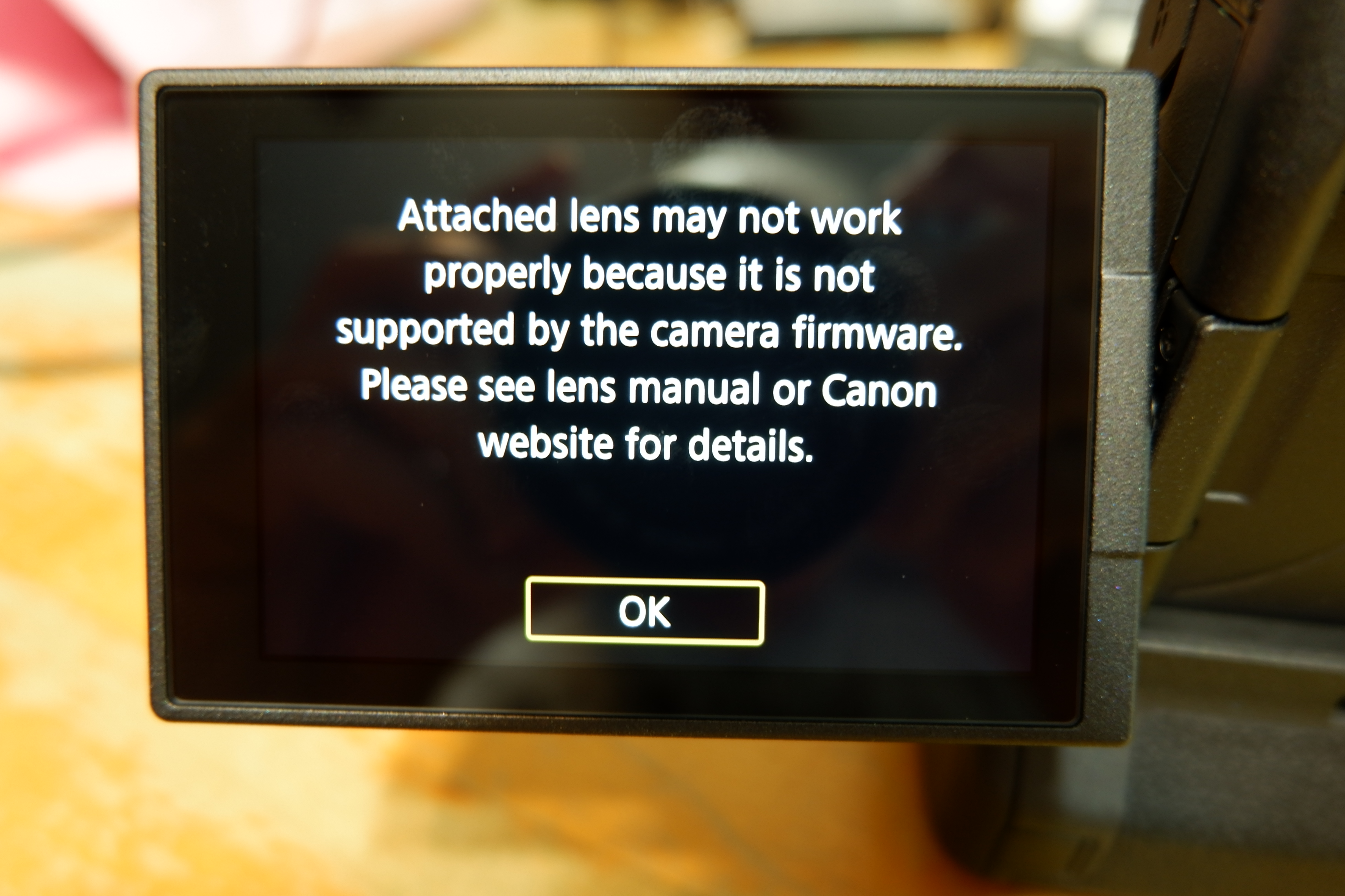 On a side note, when I installed the RF 50mm f1.8 USM lens last night I realized that my new camera had the previous firmware installed as I had this pop up on the LCD –