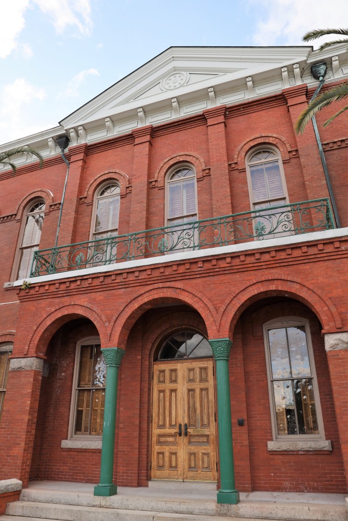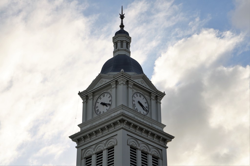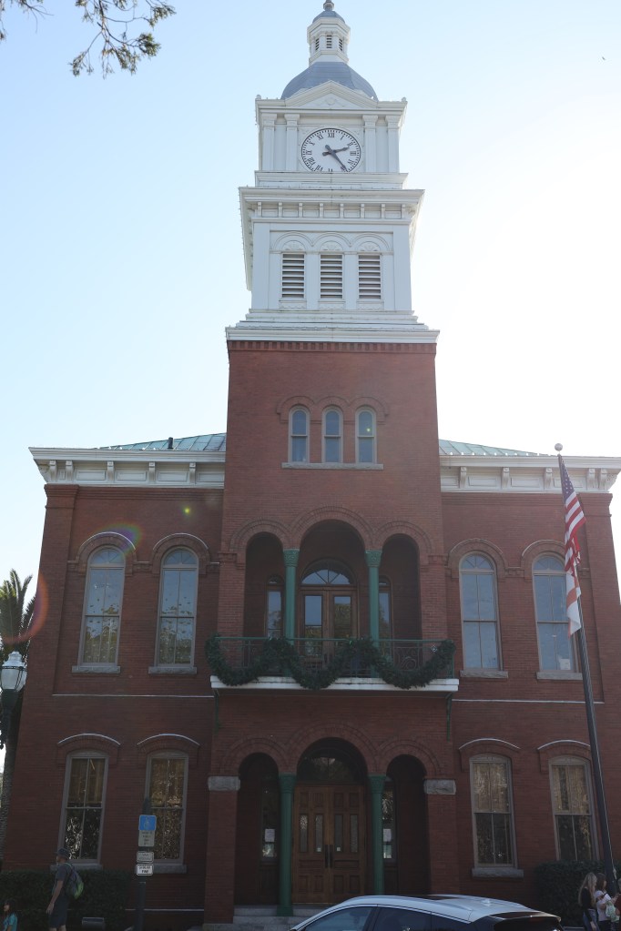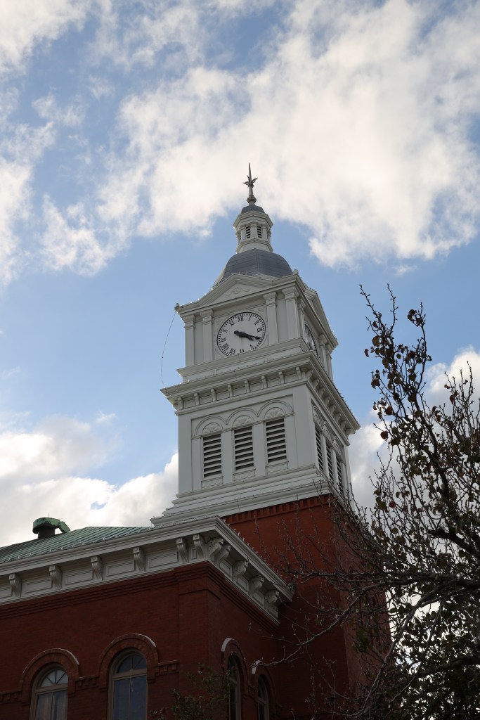 No, not that one. The tower in our little ‘city’ is doing just fine. Erected in 1891 it’s part of the Old Nassau County Courthouse. Here’s just the uppermost part of this beautiful tower (with Christmas lights still attached).