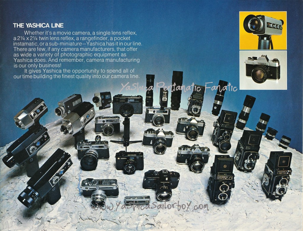 A dream collection of Yashica cameras – if only it was 1975 again! This photo is from the Yashica publication intended for US camera dealers and represents only a small portion of what was available from Yashica in 1975. Conspicuous in its absence is the flagship TL Electro-X ITS with its distinctive gold electron logo on the pentaprism.