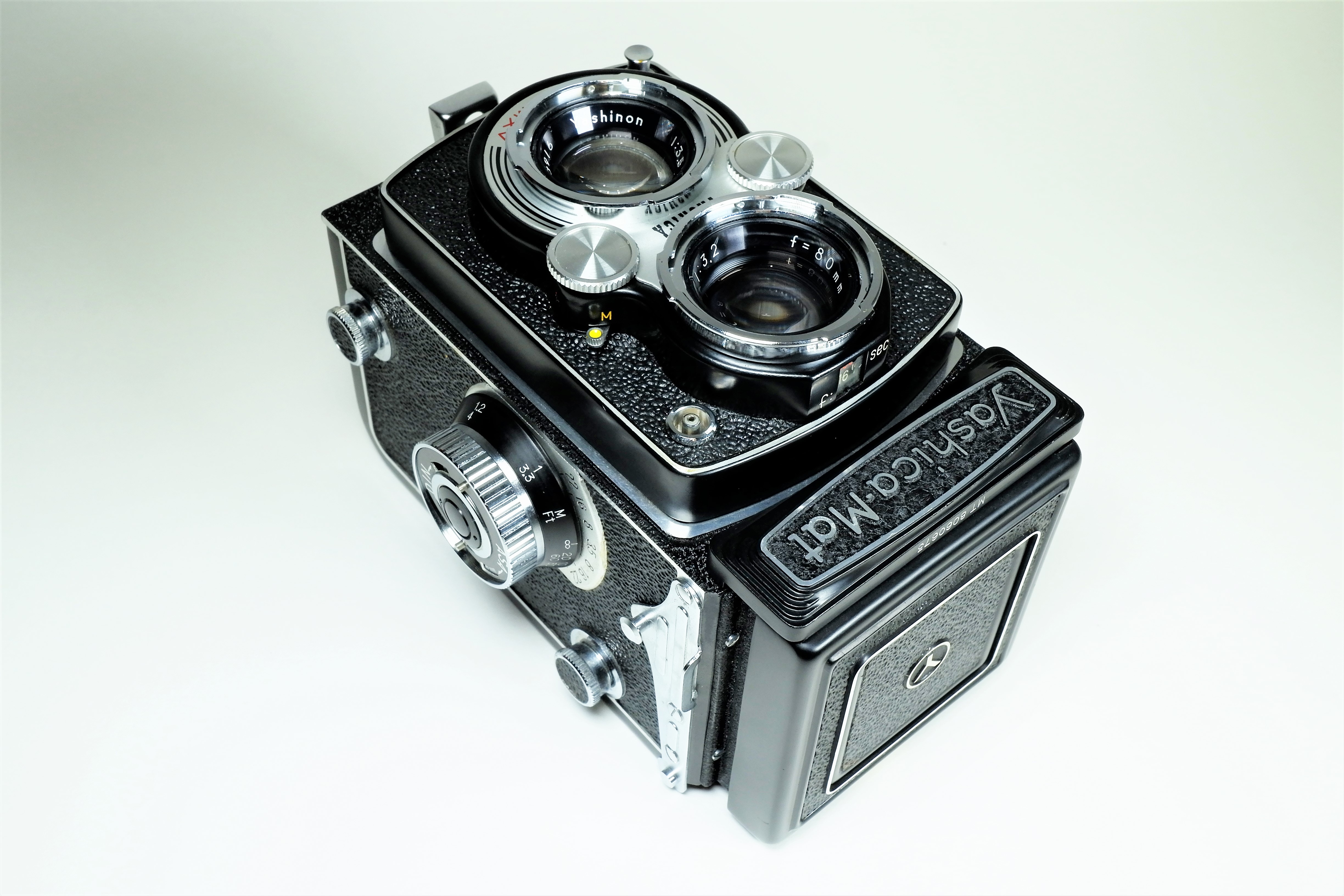 This one is from 1968. It features an 80mm f3.5 Yashinon taking lens (bottom) and an 80mm f3.2 viewing lens (top) with a Copal MXV shutter. This was Yashima-Yashica’s first crank film advance TLR introduced in 1957.