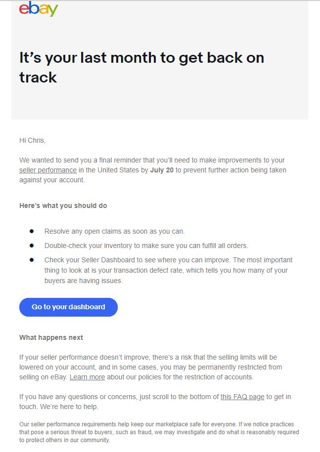 I’ve been active (very active) on eBay since 2003 and a seller since around 2008. I’ve purchased hundreds of items through eBay and of course, I’ve sold hundreds of items too. Here is eBay’s latest message to me about my performance.