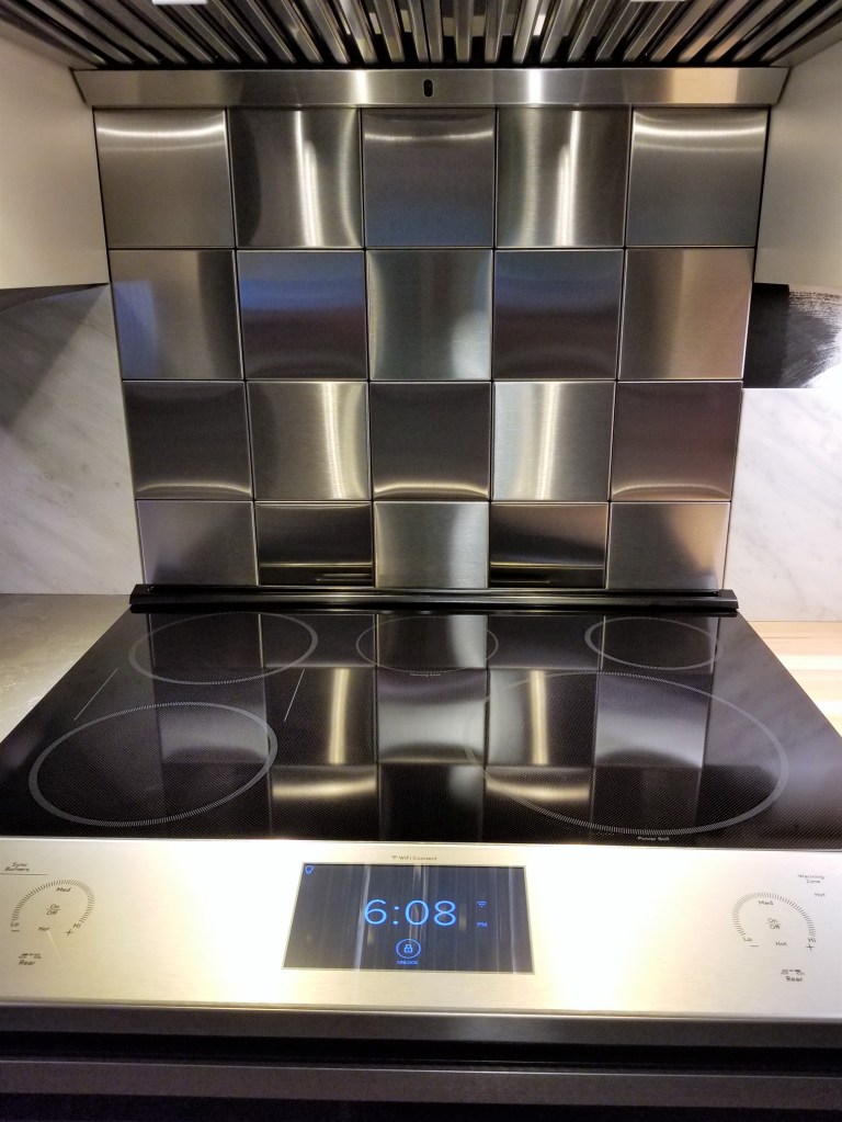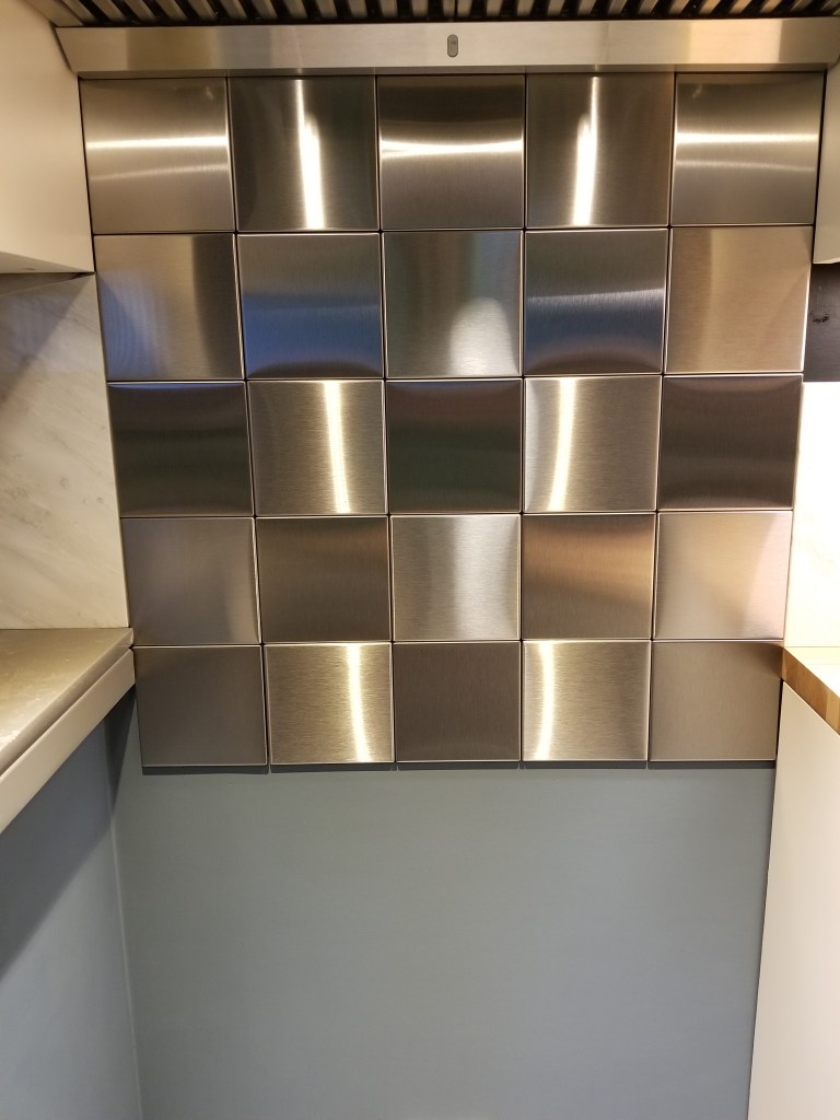 Finally! It took me the better part of a week to install these 6 x 6-inch stainless steel tiles as a backsplash behind the range. I’m very happy with the results.