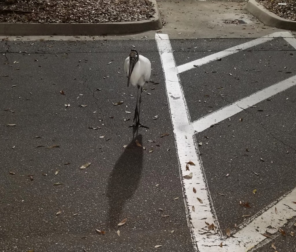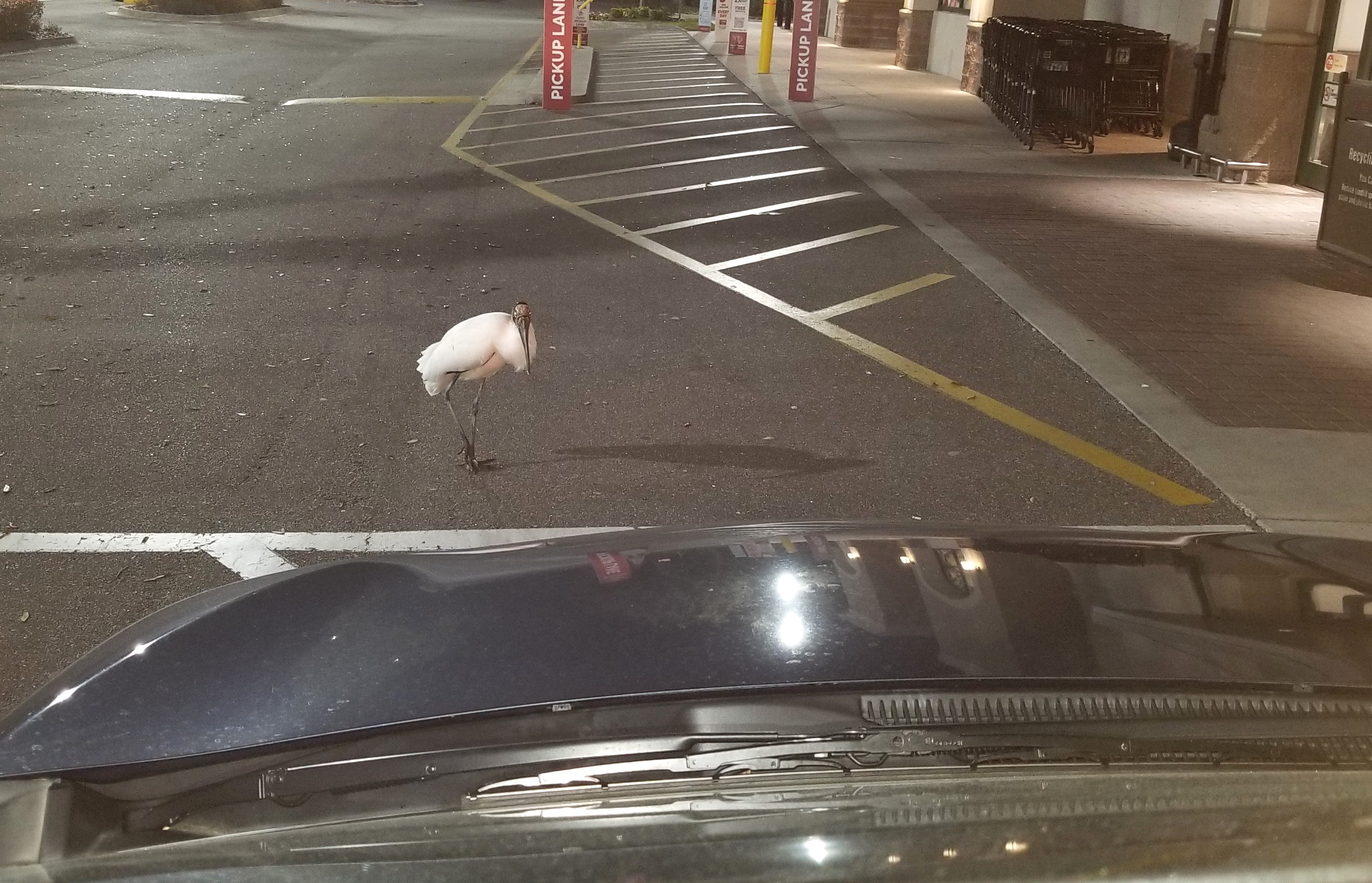 A wood stork is getting some late-night shopping at my local Harris Teeter grocery store in Northeast Florida.