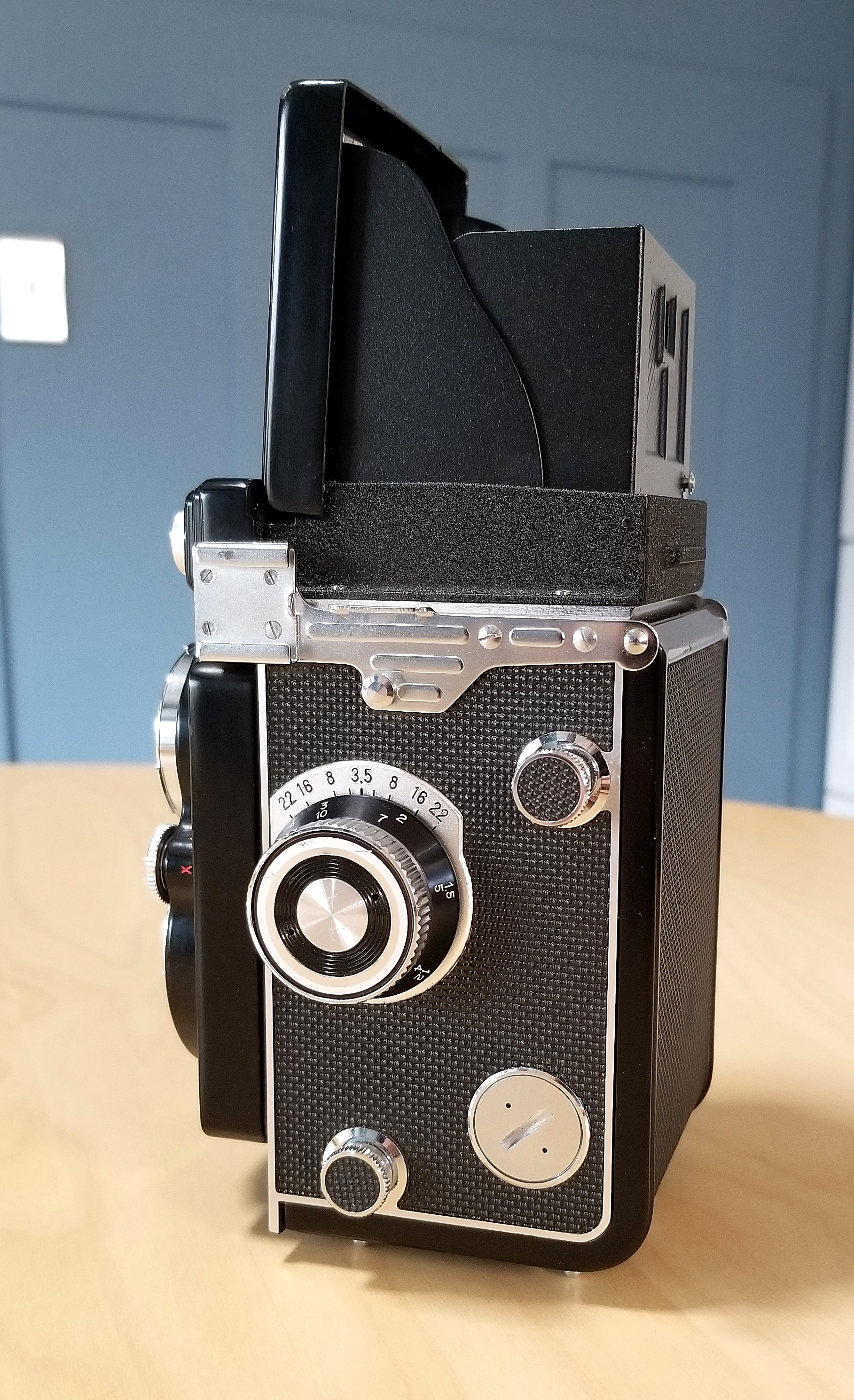 It features dual Yashinon lenses. The taking lens (bottom) is 80mm f/3.5, while the viewing lens (upper) is 80mm f/2.8. The fast f/2.8 viewing lens makes for a bright image in the viewing hood, which makes it easier to compose and focus an image.