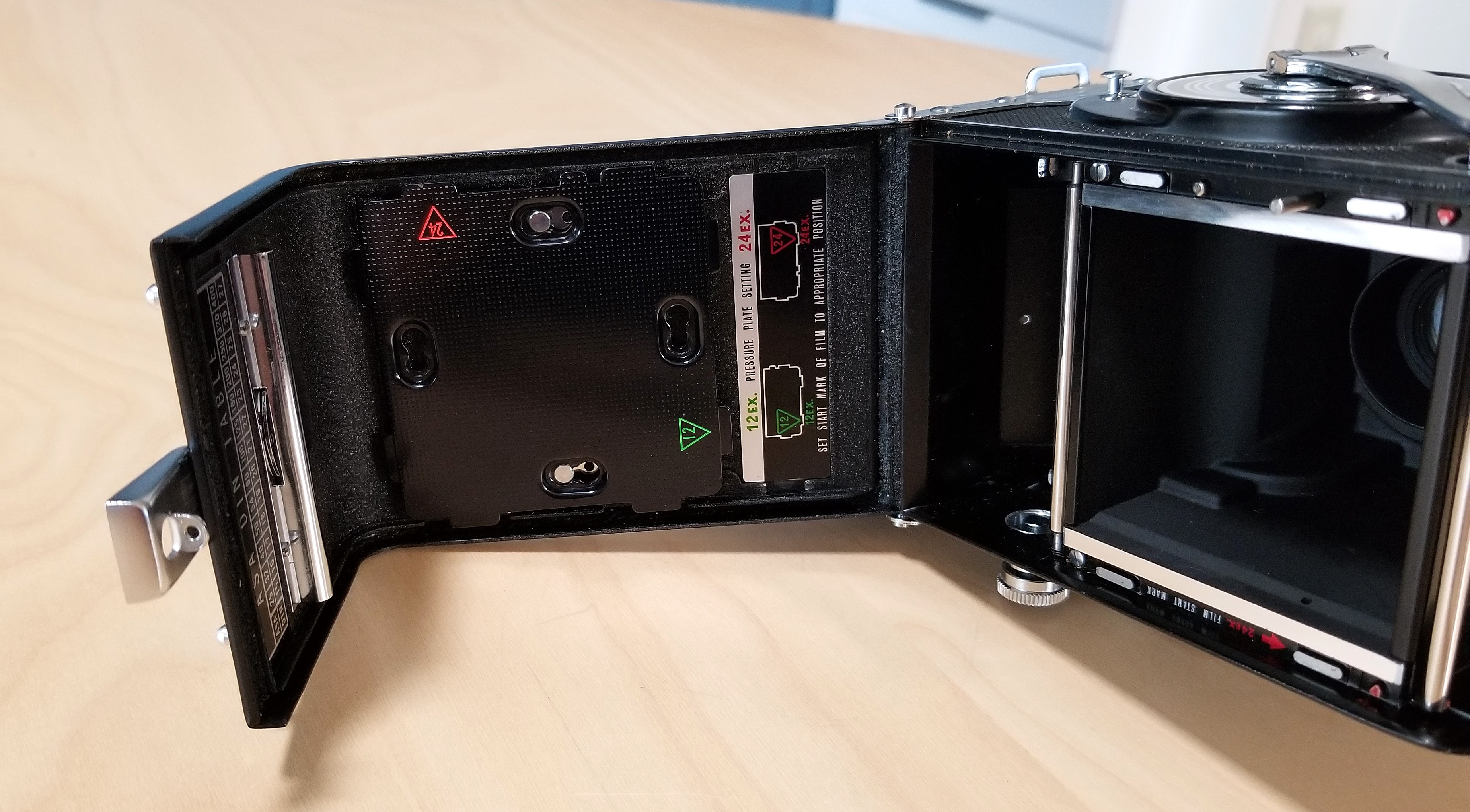The Mat-124 uses either 12-exposure 120 films or 24-exposure 220 films. The back of the taking lens can be seen on the far right in this image.