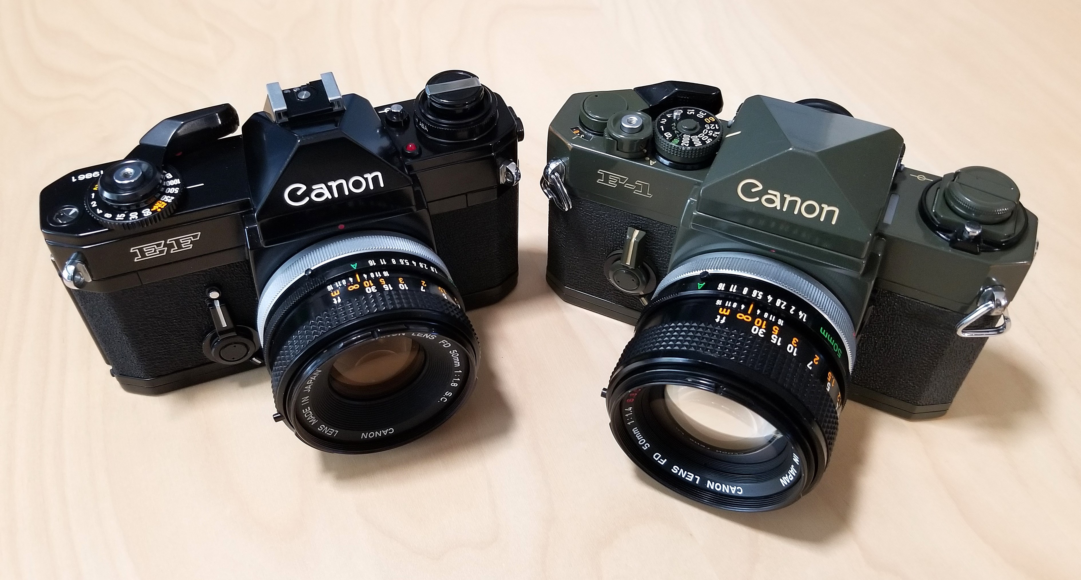 The Canon EF is a close cousin to the F-1. The EF was released in 1973, and the original F-1 in 1971. This OD F-1 (olive drab) is the only Canon F-1 in a color other than black.