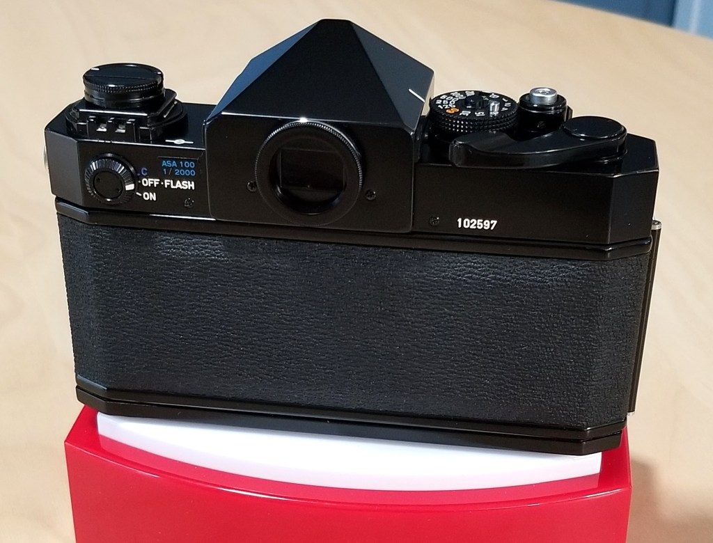 What’s interesting about this camera is that the serial number is less than 3,000, but the date stamp inside reads L712C, indicating July 1971. I have an August 1971 camera, and its SN is just shy of 20,000. My guess is that, for whatever reason, this body sat around long after its serial number was issued. The ‘C’ after the date stamp may tell the story that we’ll never know.