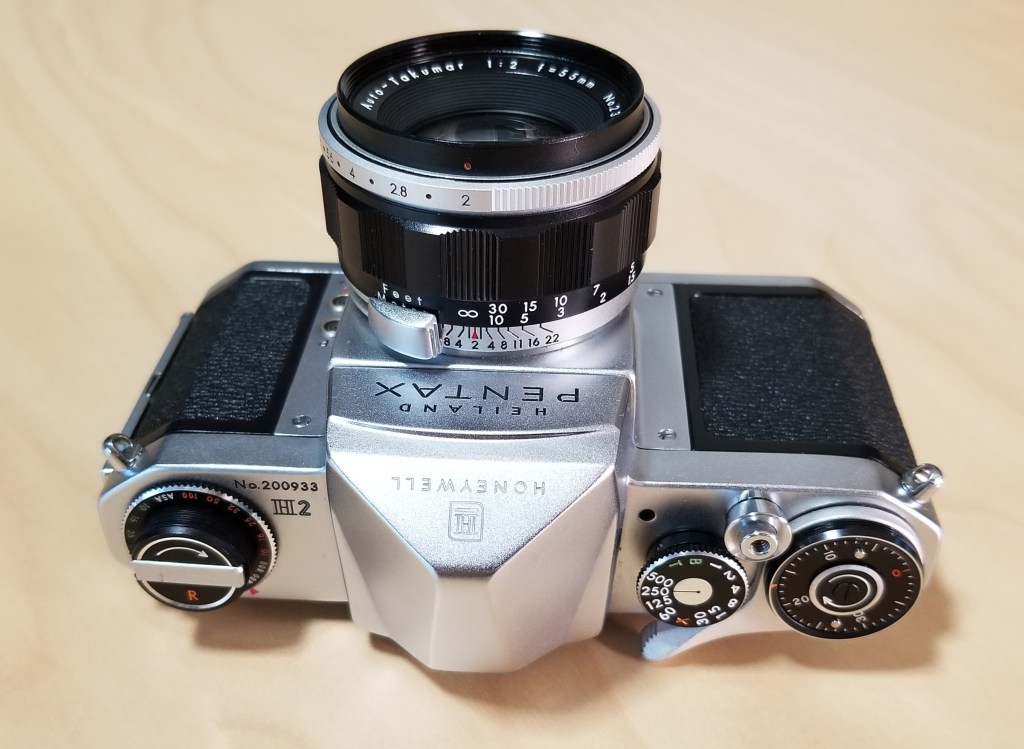 The Asahiflex IIa with a gorgeous Asahi-Kogaku Takumar f/3.5 50mm lens.