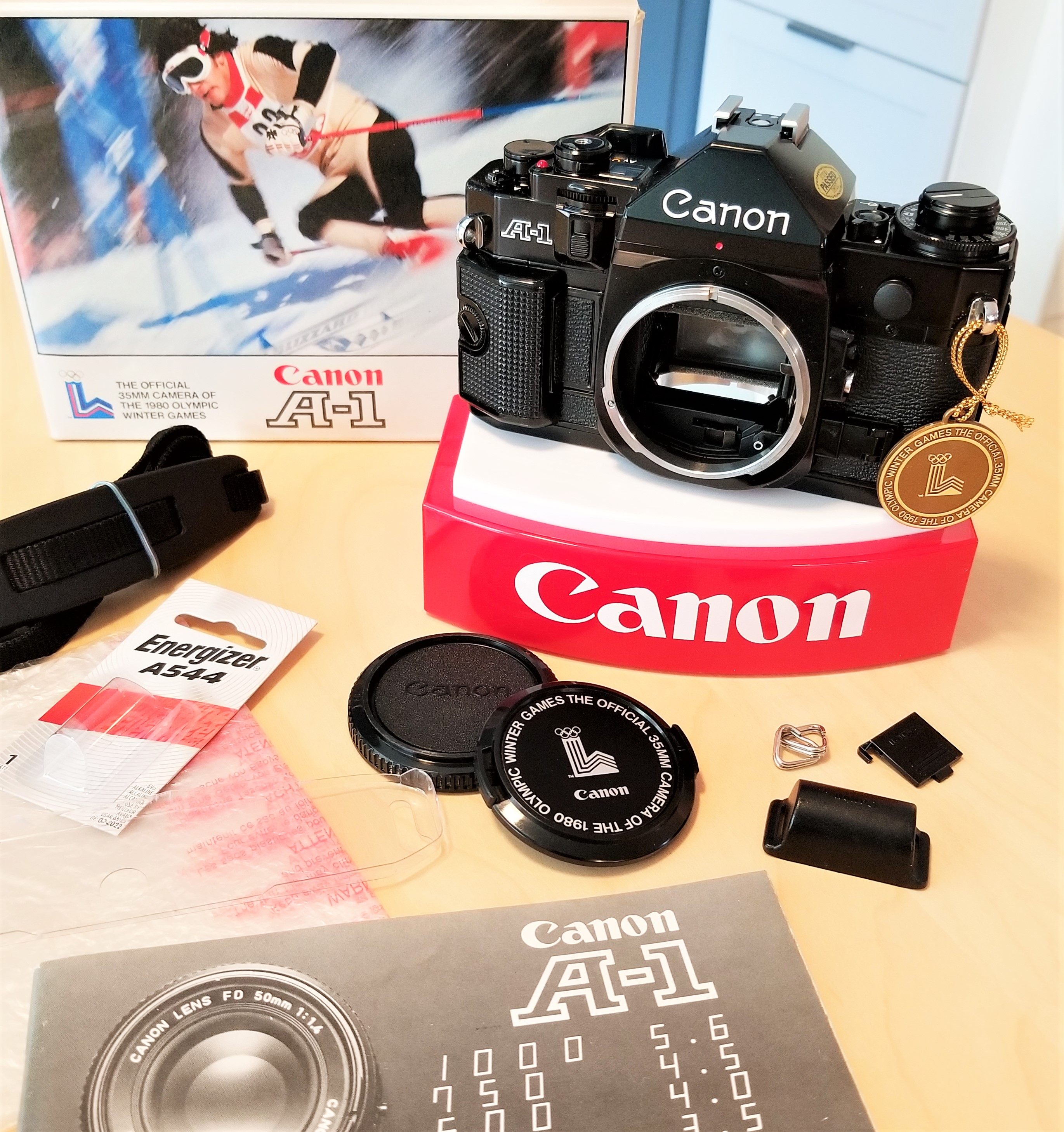 Canon never made the A-1 into an official camera for the 1984 Summer Olympics in Los Angeles but like the Canon New F-1 in 1984 complete with a limited edition logo. They did however have an Olympics Box (and lens caps). Here is my still new and never-used A-1 from 1983 in its special box.