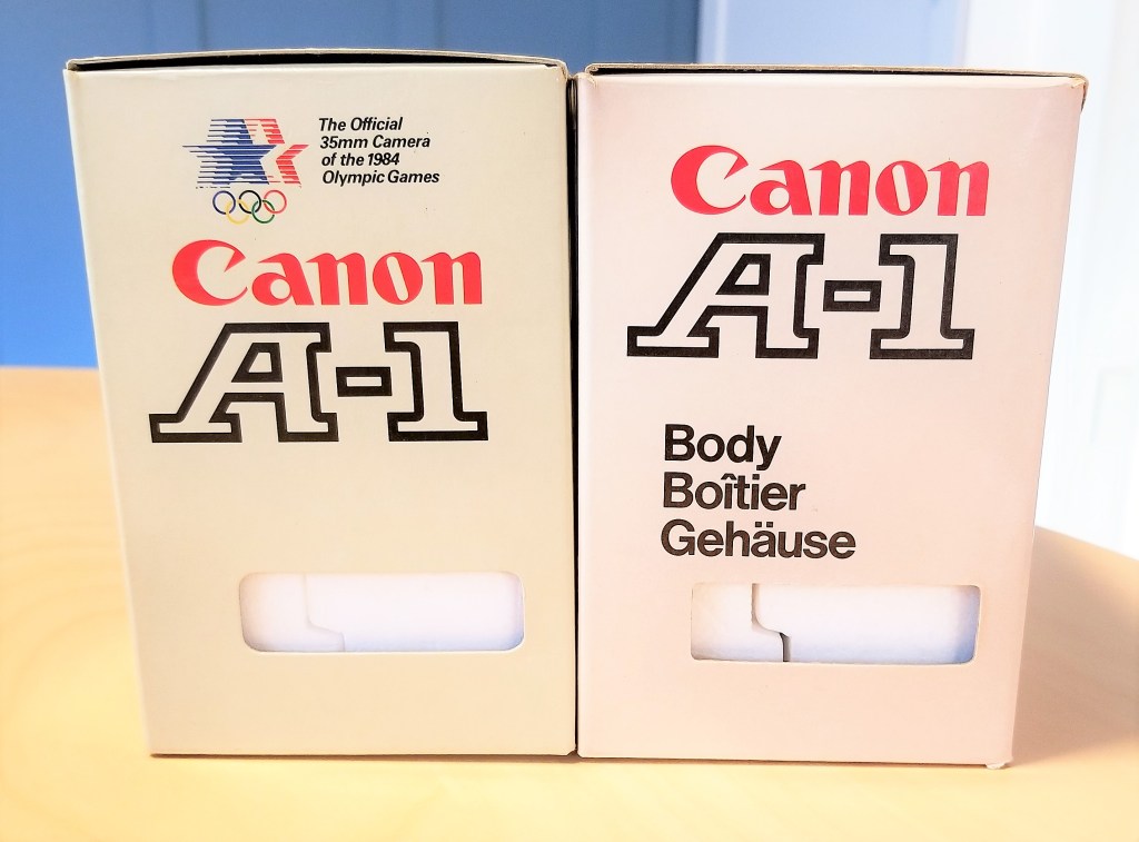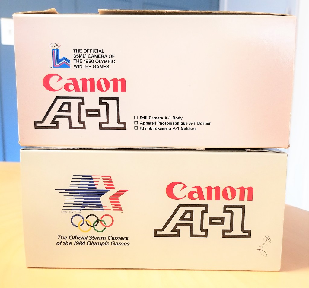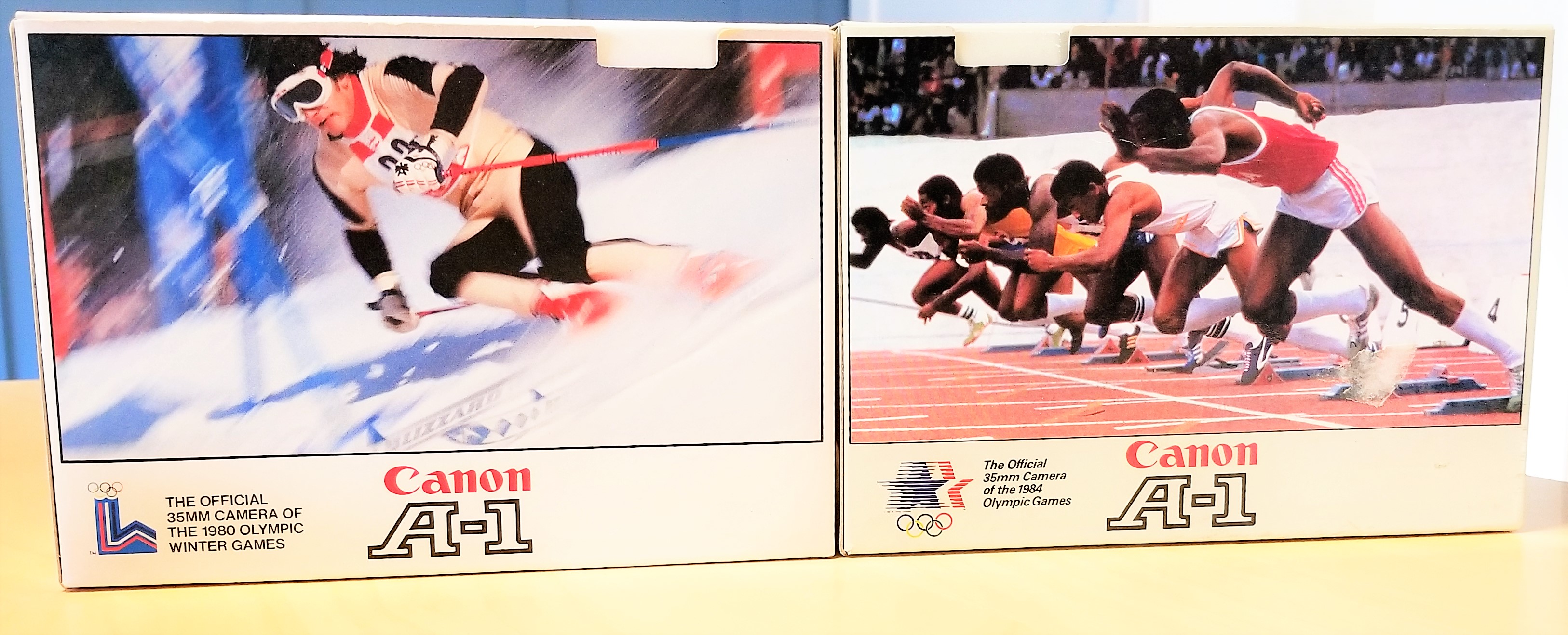 Canon A-1 camera boxes – 1980 Winter Olympics and 1984 Summer Olympics.Top view.End view.