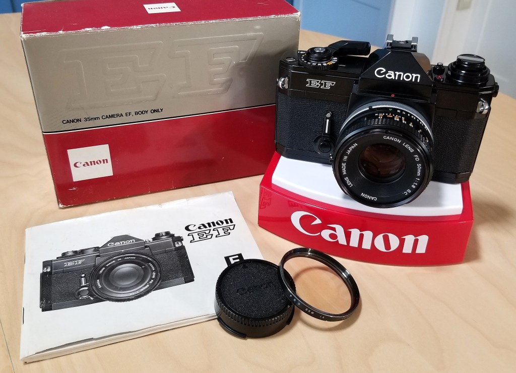 It looks great and from my experience with this model when they look this good they generally have no issues.Sharp-looking camera.Canon NFD 50mm f1.8 lens as seen from behind. BTW, the date code (Y1116) to the right of the red dot indicates that this lens was made in November 1984.Opening the aperture blades to f1.8 and shining a bright LED light reveals the hidden issues with the lens – haze and overall edge cloudiness.
