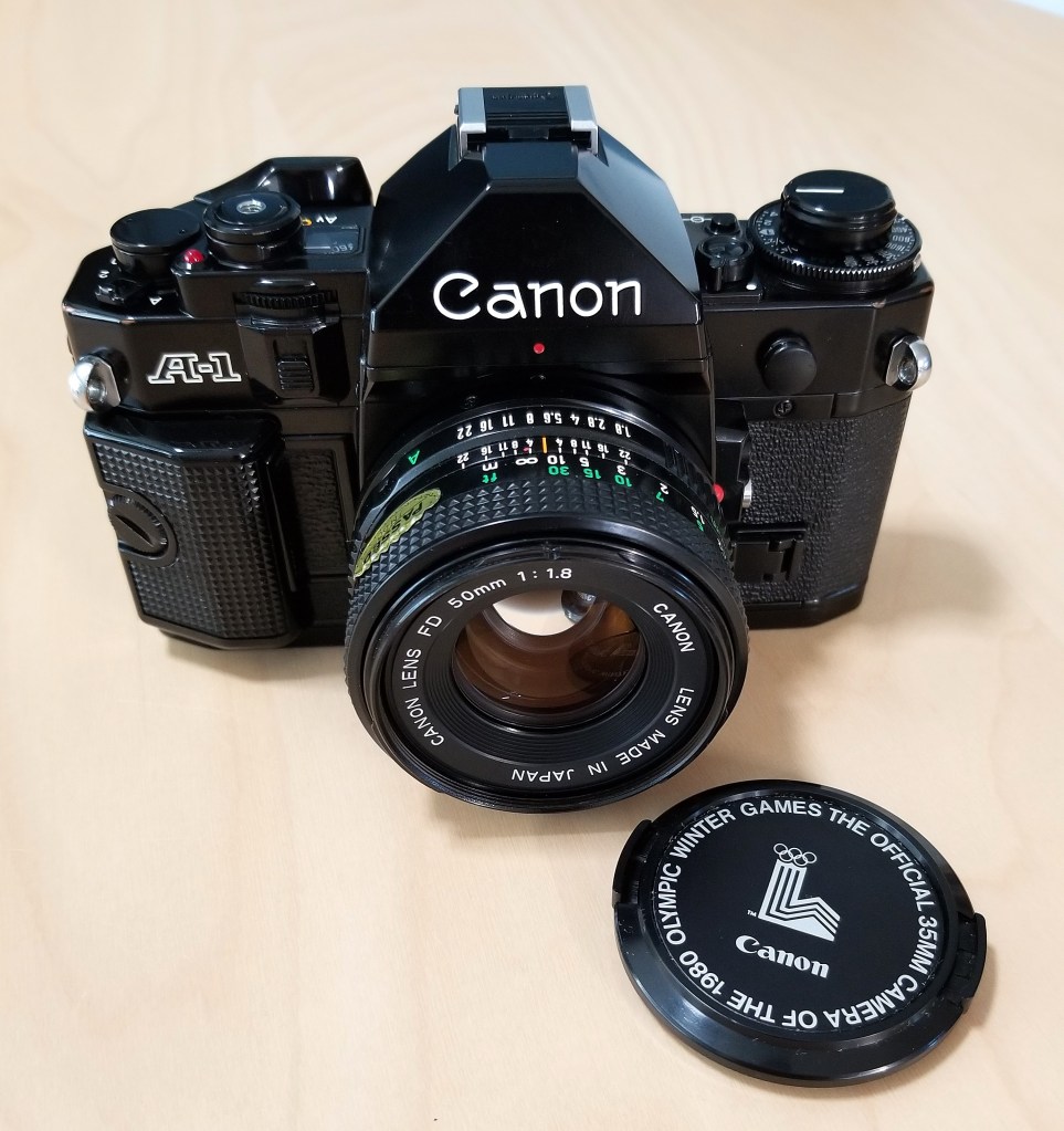 This gorgeous A-1 was made in September 1983 – just in time for the upcoming Olympics in LA.One of Canon’s most advanced electronic cameras of the late 1970s into the mid-1980s.Compact 35mm SLR with a host of features including full manual.Nothing nicer than an all-black SLR in new condition.A gem!Starting with the 1976 Summer Olympics in Montreal Canon has been the “Official Camera”.