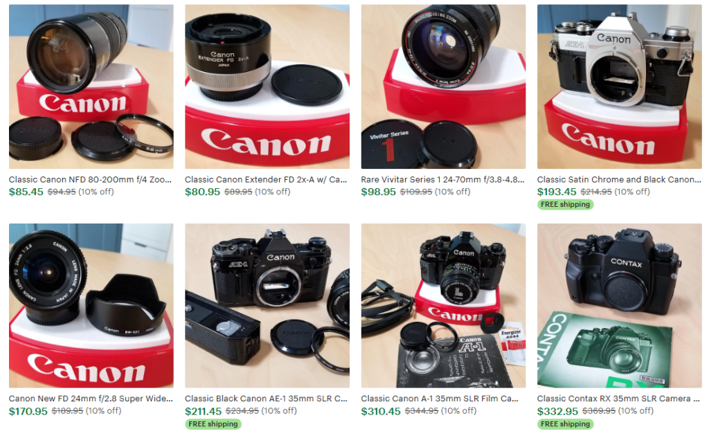 Classic Canon A-1 with a Canon NFD 50mm f/1.8 lens and limited edition 1980 Winter Olympics Lake Placid lens cap.A Canon FT QL 35mm SLR. This was released just before the Canon F-1 was released in the summer of 1971. The FT is built like a tank and will probably outlast us all.A favorite! The 1994 Contax RX is pretty close to the perfect film camera. Add a Contax Carl Zeiss T* lens, and you have photographic excellence.Attention Pentax fans. This is an Asahi Pentax SL from around 1968. It is in perfect condition inside and out and fully serviced. It is ready for film and ready for your next photo walk.Rare, rare, and more rare. From 1978, a completely new and never used Nikon F2A with its original box and certified Nikon USA 25th Anniversary Edition.Canon’s Black Beauty is a close cousin to the famous Canon F-1 but with some significant differences. In addition to a fully manual mode, it can shoot automatically in shutter priority mode. You select the shutter speed, and the camera sets the proper aperture. It can electronically time the shutter to up to a 30-second exposure. It’s one of Canon’s best designs from the mid-1970s.This is a rare Nikon blue canvas messenger bag. It was released in limited quantities as a promotional item around the same time as the F2A and F2AS in the late 1970s. It’s new and never used, making it a perfect gift for a Nikon collector.