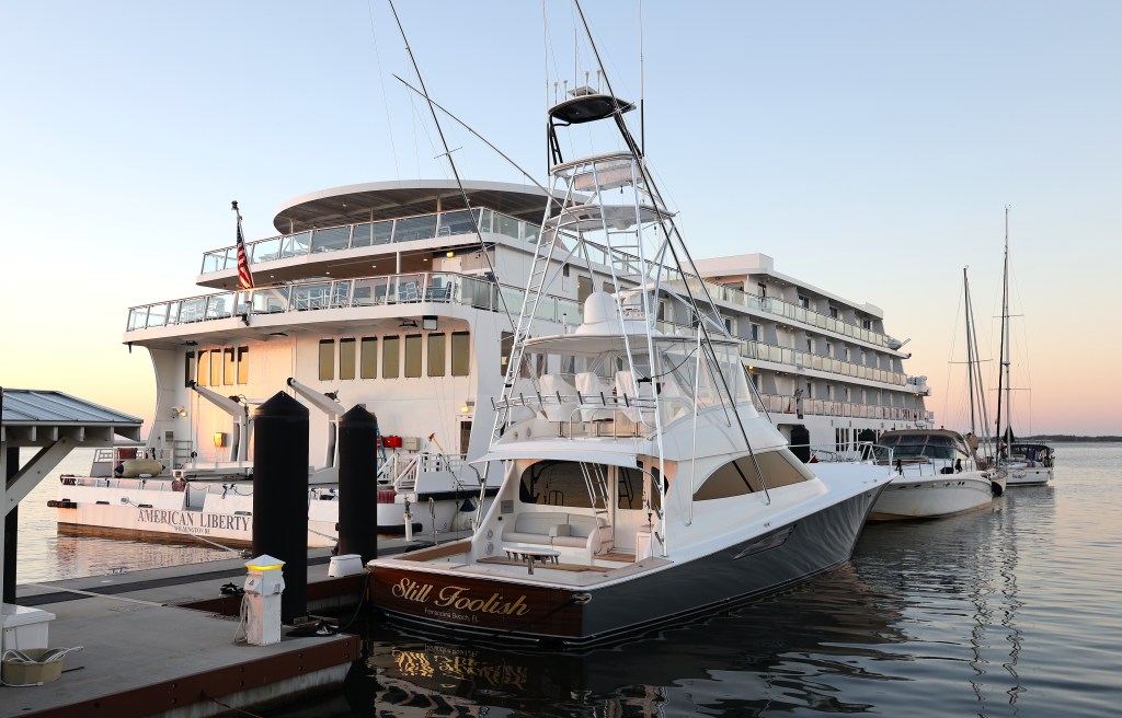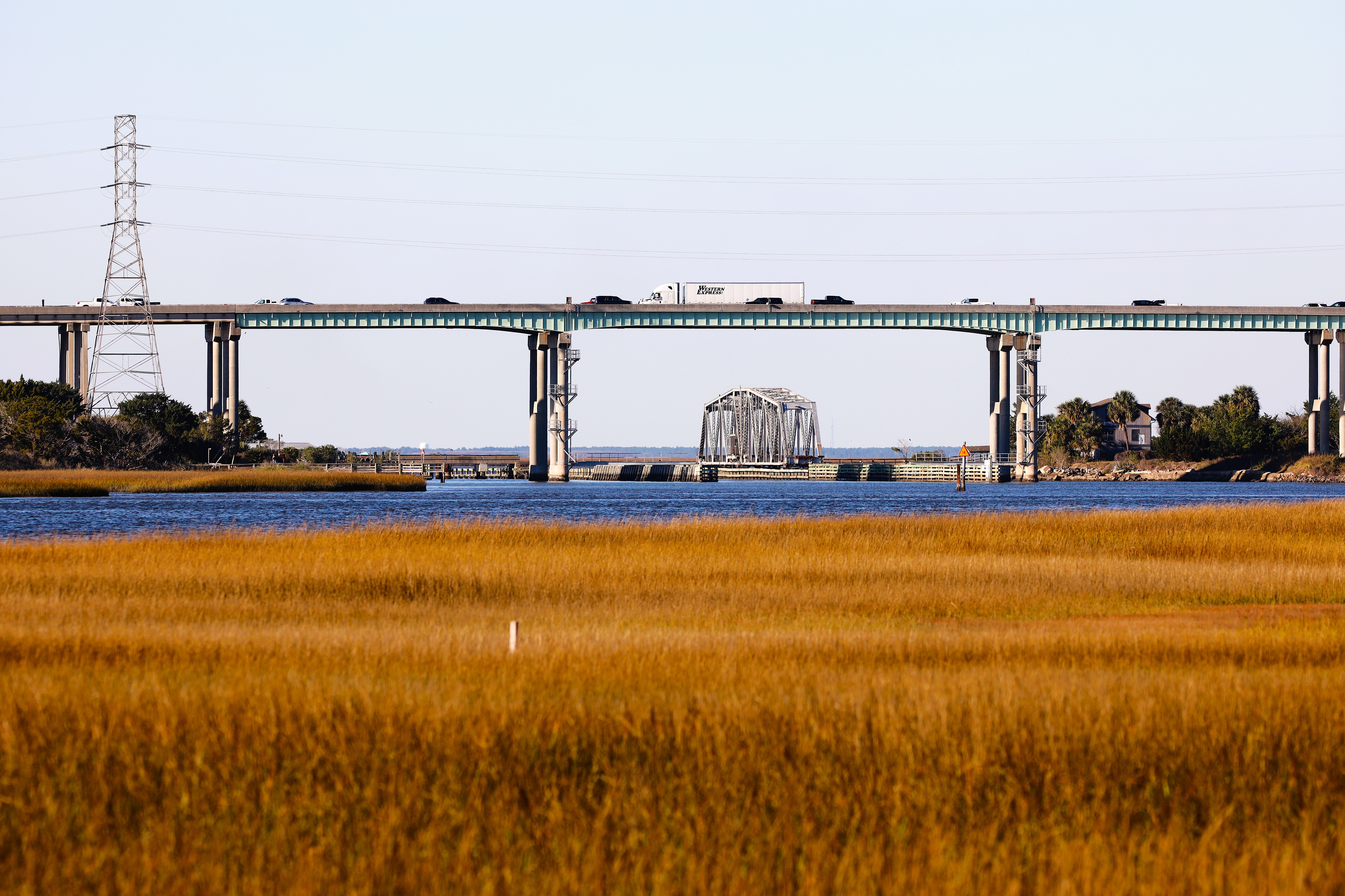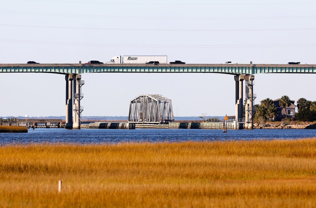 A lot can be seen in this image, such as the Thomas J. Shave, Jr. Bridge over the Intracoastal Waterway (Amelia River) and the railroad swing bridge framed in the center.