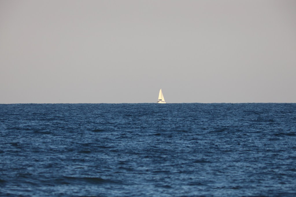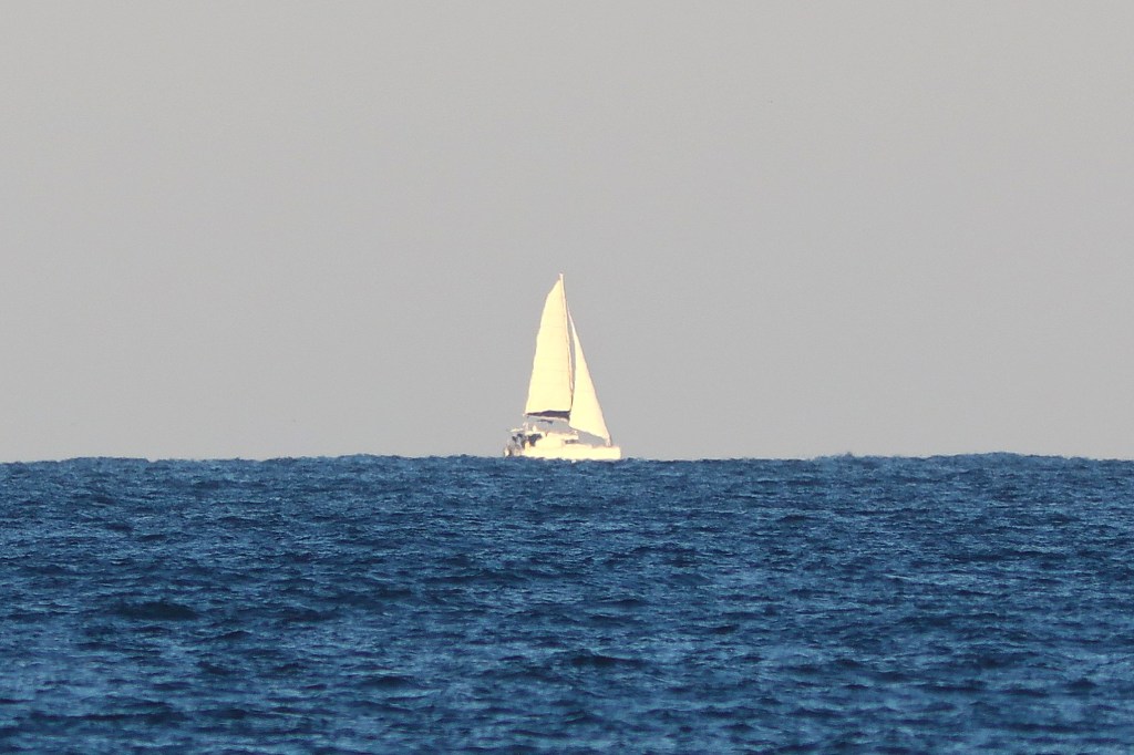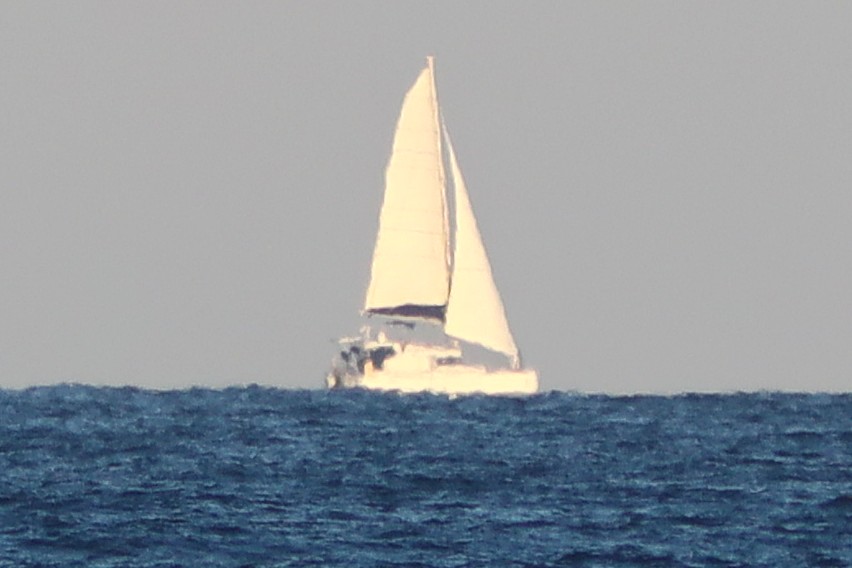 Uncropped image of a sailboat taken with my 600mm lens. With the naked eye, the boat was a white spot on the horizon.A slight crop of the original image reveals additional details.At an extreme crop. My Canon EOS R does well with its 30.3 megapixels.Canon EOS R.