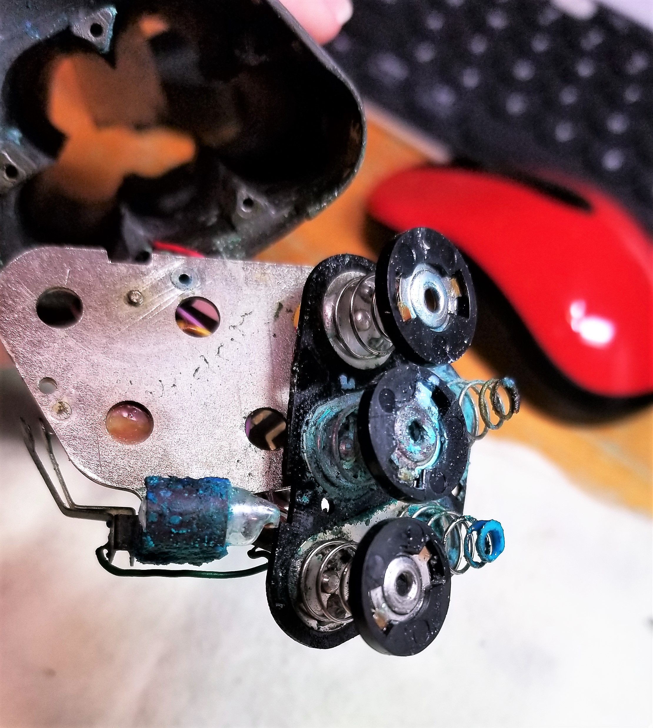 This is the non melted side of the receptacle. Notice the two rusted screws – they were the early warning signs of trouble. The outlet box and receptacle are mounted on an outside wall behind a brick exterior. Although there’s a vapor barrier (I hope) behind the brick and wood sheathing it’s still an unheated space – moisture in the air condensed on the terminals and caused rust. The rust loosened (slightly) the connections and created resistance which led to heat which led to the short and meltdown.