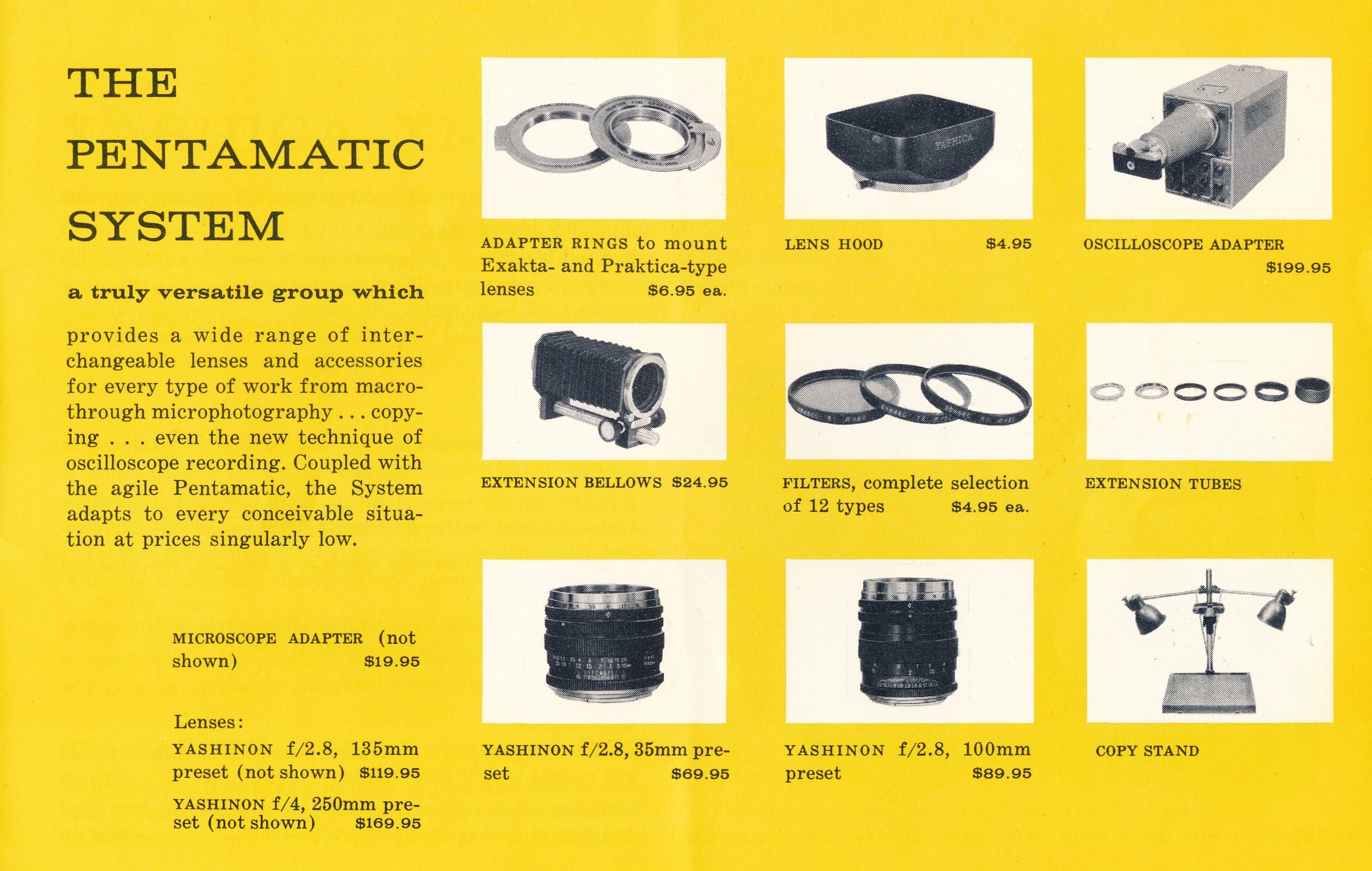 Page 2 shows (with prices) a nice selection of accessories for the Pentamatic. It appears that at the time of this brochure that there were 5 lenses available in the Pentamatic bayonet mount.