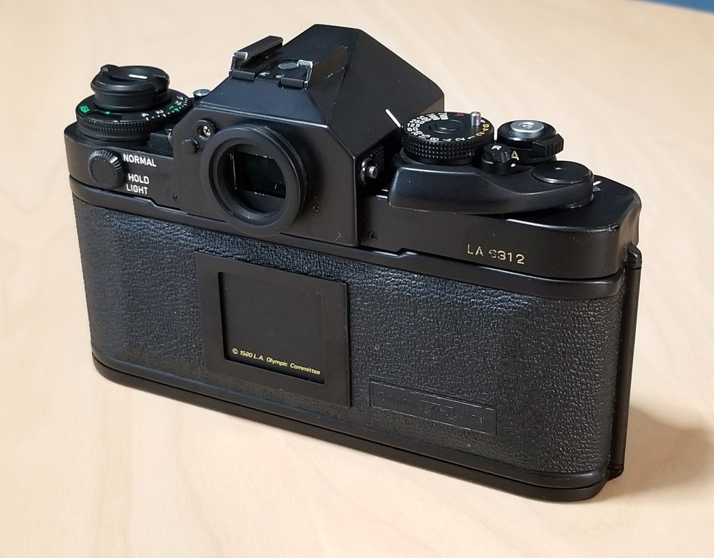 My strange Canon New F-1 Los Angeles 1984 camera. I say “strange” because the gold paint on the logos is weak and missing. The camera is definitely well-used, with plenty of dents, but shows no brassing. It’s a genuine Olympics body with a date code X1123 (Nov 83) and a proper LA6312 serial number. It works perfectly (not film-tested yet). It could make a fun user camera, as most people wouldn’t use a limited-edition camera and risk beating the heck out of it. Please let me know your thoughts. Should I attempt to fill in the gold or leave it be? It would be difficult to match the gold without mucking it up, so I have that going for me.